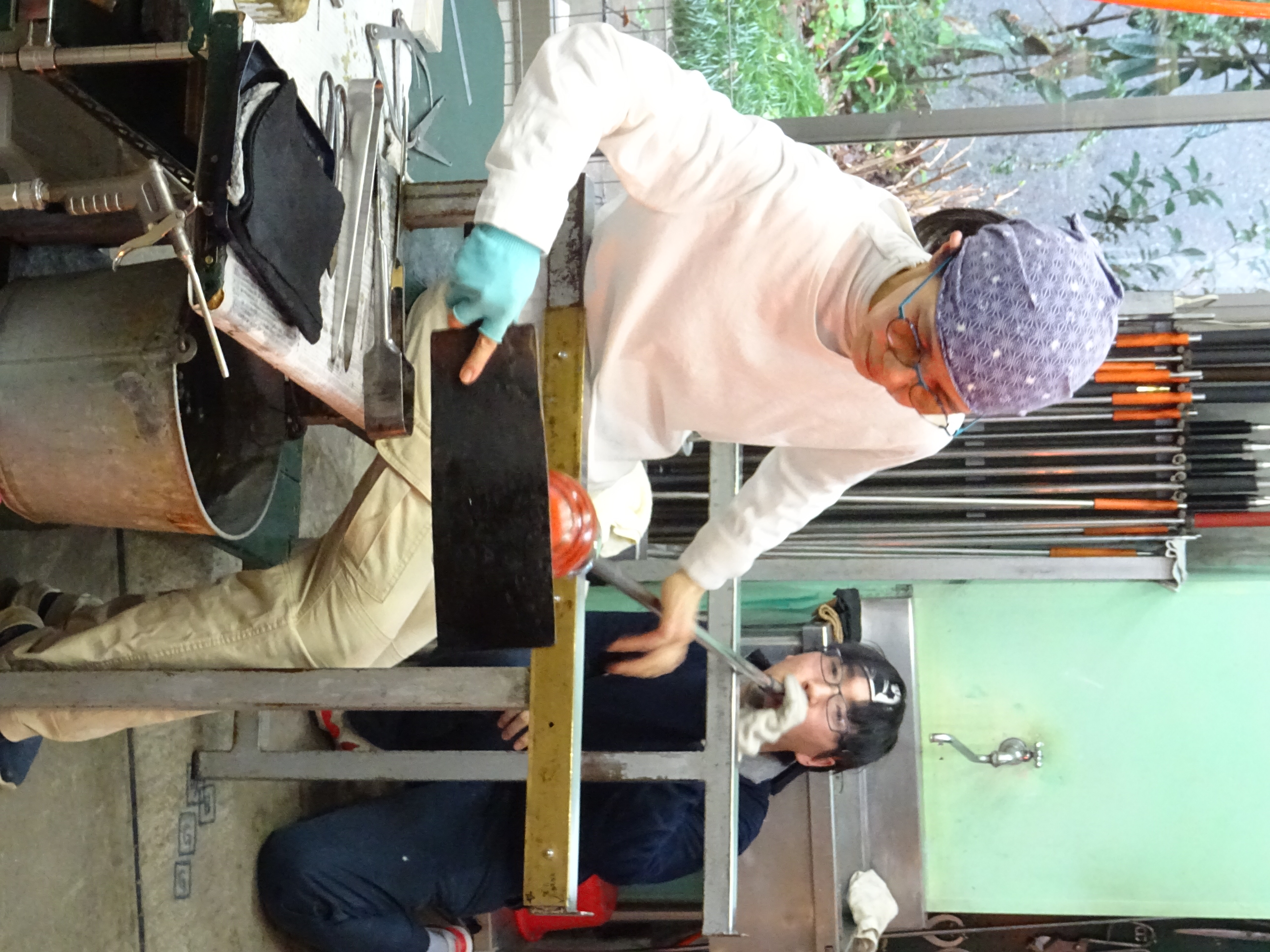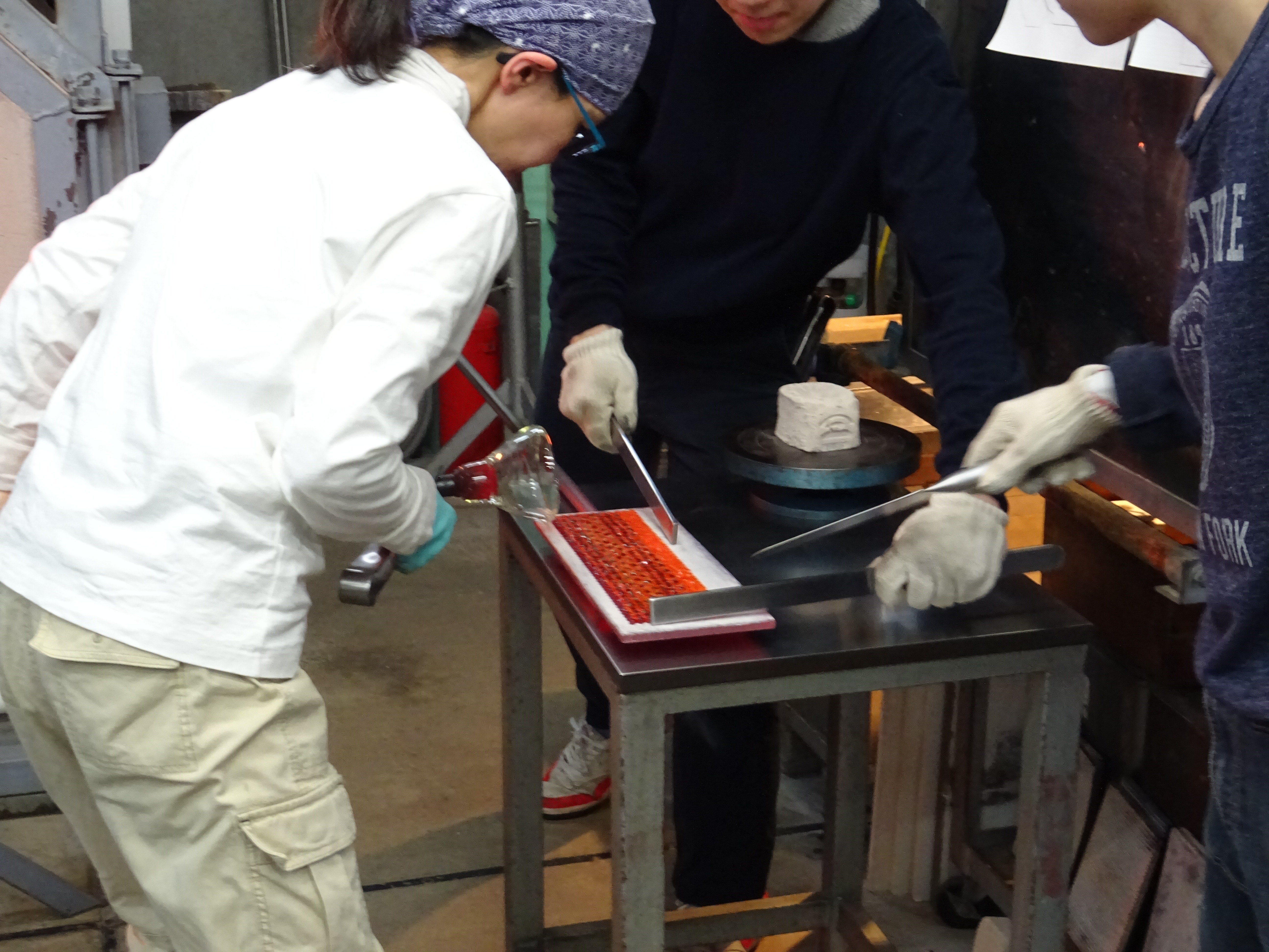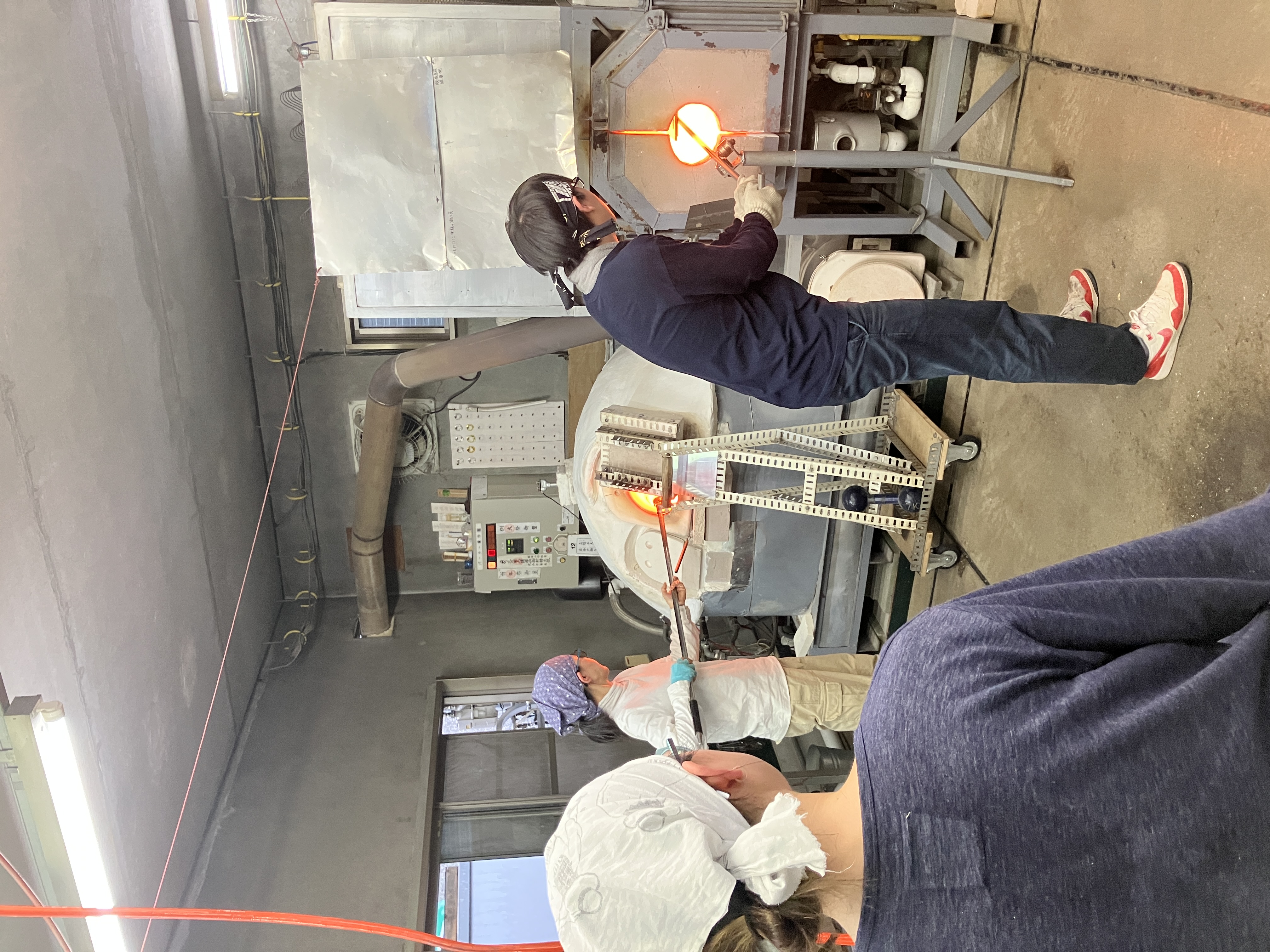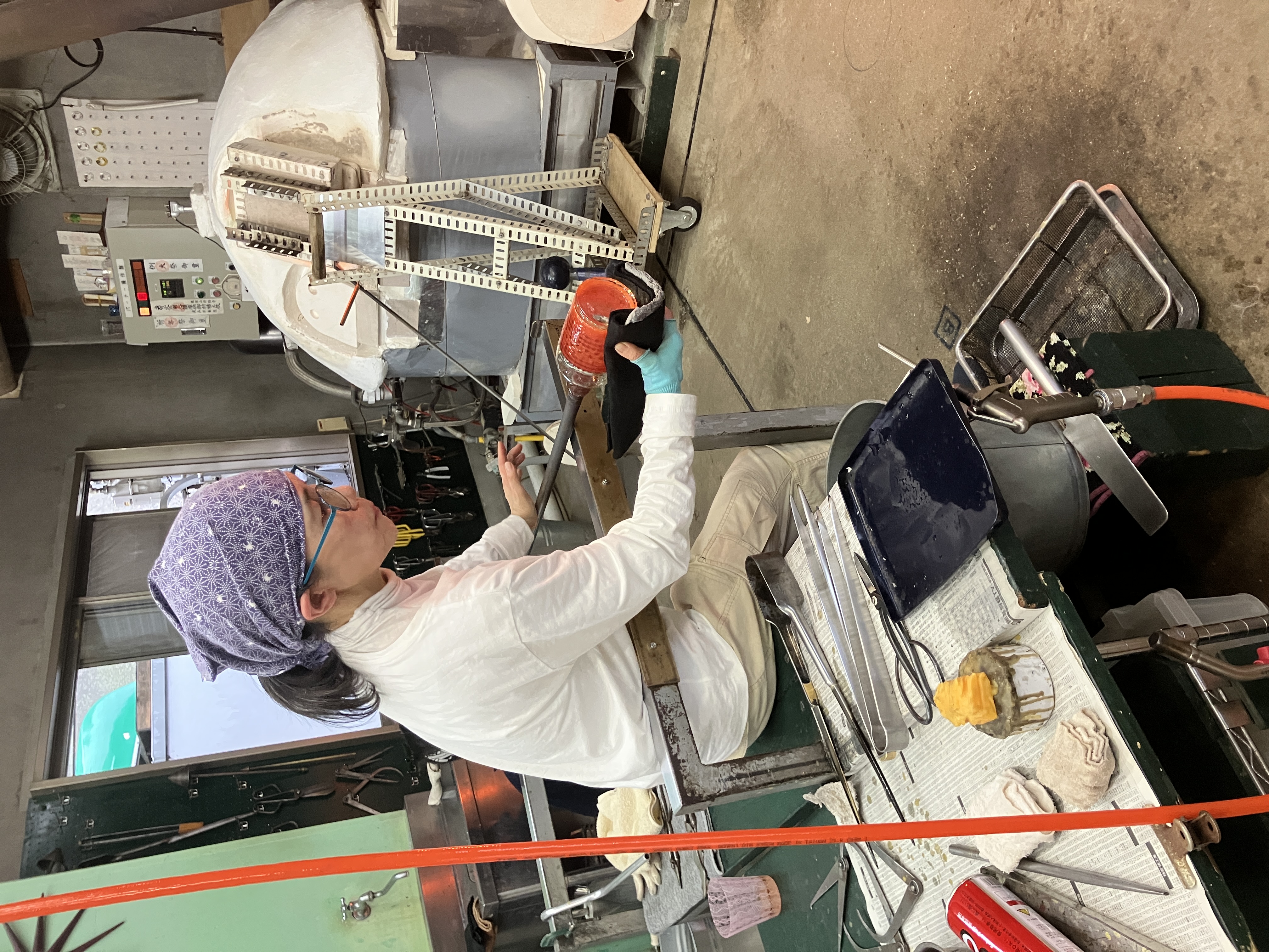 工房見学記 3月、とある日のお昼過ぎ、神奈川県は三浦半島のガラス作家・江波冨士子さんの工房へ見学に行ってきました。工房の名前は潮工房、1998年にパートナーの小西潮さんと江波さんが作った工房です。 私が工房へお邪魔するのは今回で2回目。前回は個展の打ち合わせ、今回は実際に作品がどのようにして作られているか、一泊二日の日程で時間を気にせずじっくりと、工房での作業を見学させて頂きました。 写真<左>アシスタントの方と声をかけあいながら進められる作業の一コマ 「いつもニコニコ潮工房」という文字が書き込まれています。 <右>ガラス製作や掃除道具がきれいに整頓されています ○16時からお夕飯まで 先ずはお茶碗。 お茶碗は江波さんとアシスタント2名、計3人がかりで制作します。 あらかじめ板に並べたムリーニと呼ばれるガラス片を予熱した板に置いて、その後、炉に入れて出す、という作業を何度か繰り返し、ムリーニ同士を接着します。 様々な種類のムリーニを綺麗に並べた状態 これから熱していく 次にムリーニを温めている一方で坩堝から透明のガラスを出して土台を作成します。 土台が出来たらムリーニと接合させて形を整えていきます。 何度も炉に入れて温めながら形を調整し、始めは開いていた口の部分を丸く閉じ、それから江波さんがポンテを回し、彼女の合図に合わせてアシスタントの方がガラスの反対側から空気を吹き込みます。 温めたムリーニを土台に接着しているところ 火とガラスとアシスタントの方と息を合わせて動き続ける事1時間と少し、鮮やかな色の夏茶碗が完成しました。 この日は茶碗の他にコップを2つ製作しました。 コップは一つ作るのに約30分ほどでした。 作品を製作している過程を見せて頂いて改めて思ったのは、吹きガラスの仕事というものは1人ではできないという事。親方がポンテを握ってアシスタントが親方の次の動きを予測しながら動き、タイミングを見計らって道具の出し入れをしたり、合図に合わせてガラスに息を吹き込んだり。声掛けをしながら丁寧に作っていきます。 江波さん「次○○しますよ」 アシスタント「はい」 江波さん「ブロウ」 アシスタント<息を吹き込む> 江波さん「ストップ」 アシスタント<息を吹き込むのを止める> 江波さん「とてもいい感じですよ。」 アシスタント「ありがとうございます。」 江波さん「もう一度やってみましょう。」 アシスタント「お願いします。」 江波さんとアシスタントの方の会話のキャッチボール、聞いていてとても心地よかったです。 ○18時すぎ、お夕飯 夕飯はアシスタントの方が持ち回りで毎日作っているらしく、その日の賄いはパクチーの乗ったココナツカレーとチキンスープとキャベツの和え物。とっても美味しかったです。 夕飯後はムリーニのパーツ作りを見学しました。今回作ったのは紫色の花びらのお花。花弁や花びら一枚一枚のパーツを組み合わせておよそ10*10*15cmの四角柱を作り、最終的にブロアーでガラスに空気を当てながら両端を引っ張り伸ばしていきます。 花びらを製作しているところ 約2mほどに引き延ばされた棒は約30cmずつに裁断され、後日さらに小さいピース(ムリーニ)になります。 江波さんのガラスは多種多様な模様のムリーニを作り、それを組み合わせて吹きガラスの手法で様々な形の器を創り出しています。 ところで、江波さんがガラスに興味を持ったきっかけは、浪人生時代に有楽町のあるギャラリーで見た北欧のガラス作品との出会いだったそうです。それまでは陶芸を学んでいたので、美術大学では陶芸をと思っていたようなのですが、北欧のガラスとの出会いがきっかけでガラスの勉強が出来る多摩美術大学へ入学、その後富山のガラス造形研究所へ入所、アメリカに渡ります。2年間アメリカのガラススタジオでアシスタントを経て、帰国後パートナーの小西さんと共に工房を立ち上げ今に至ります。 また、大学生の頃から長らくガラス中心の生活をしていた中で、2018年、江波さんはヴェネツィアの単身1年間語学留学を決意しイタリアへ向かいました。その一年間はガラスから離れ、ヴェネツィアで語学学校へ通い、ワインを飲み、ムリーニの生まれた場所での生活を楽しんだそうです。 「それまで前に進むことばかりで、途中で立ち止まるという事をしなかったのだけれどヴェネツィアの1年間で少し立ち止まってものを見たり、引き返すという事ができました。」江波さん ガラスと離れる生活をした事によって改めてガラスに真摯に向き合うことができたそうです。そのように出来た背景には1年間江波さんが不在の間もパートナーの小西さんとアシスタントの方がしっかりと工房の炉の火を絶やすことなく、守ってくれていたから、そして帰国してすぐに江波さんが作業を出来るように準備を万端にしてくれていたからだともおっしゃっていました。 工房見学の2日目に江波さんがお茶を用意して下さっている時に、パートナーの小西さ