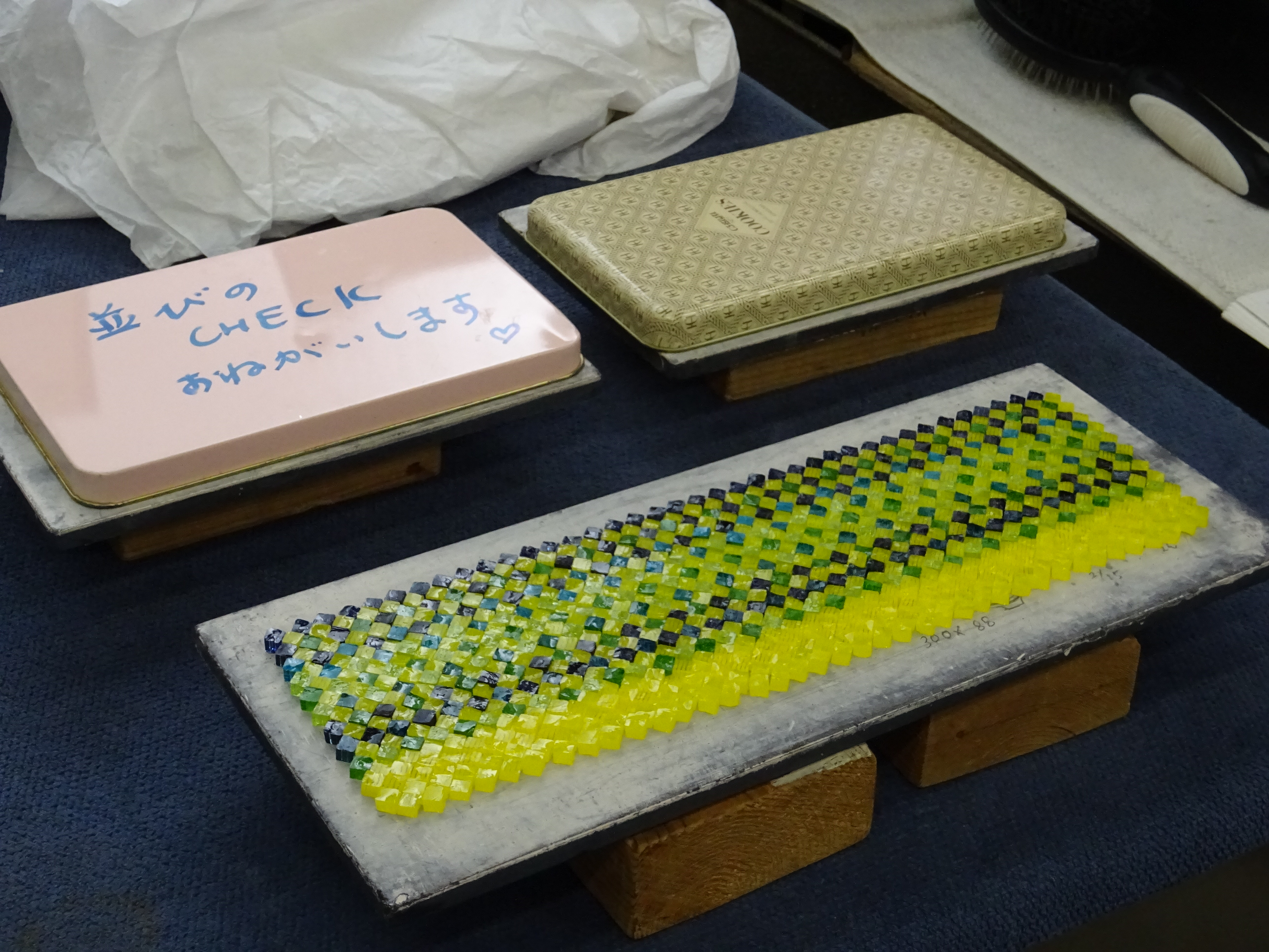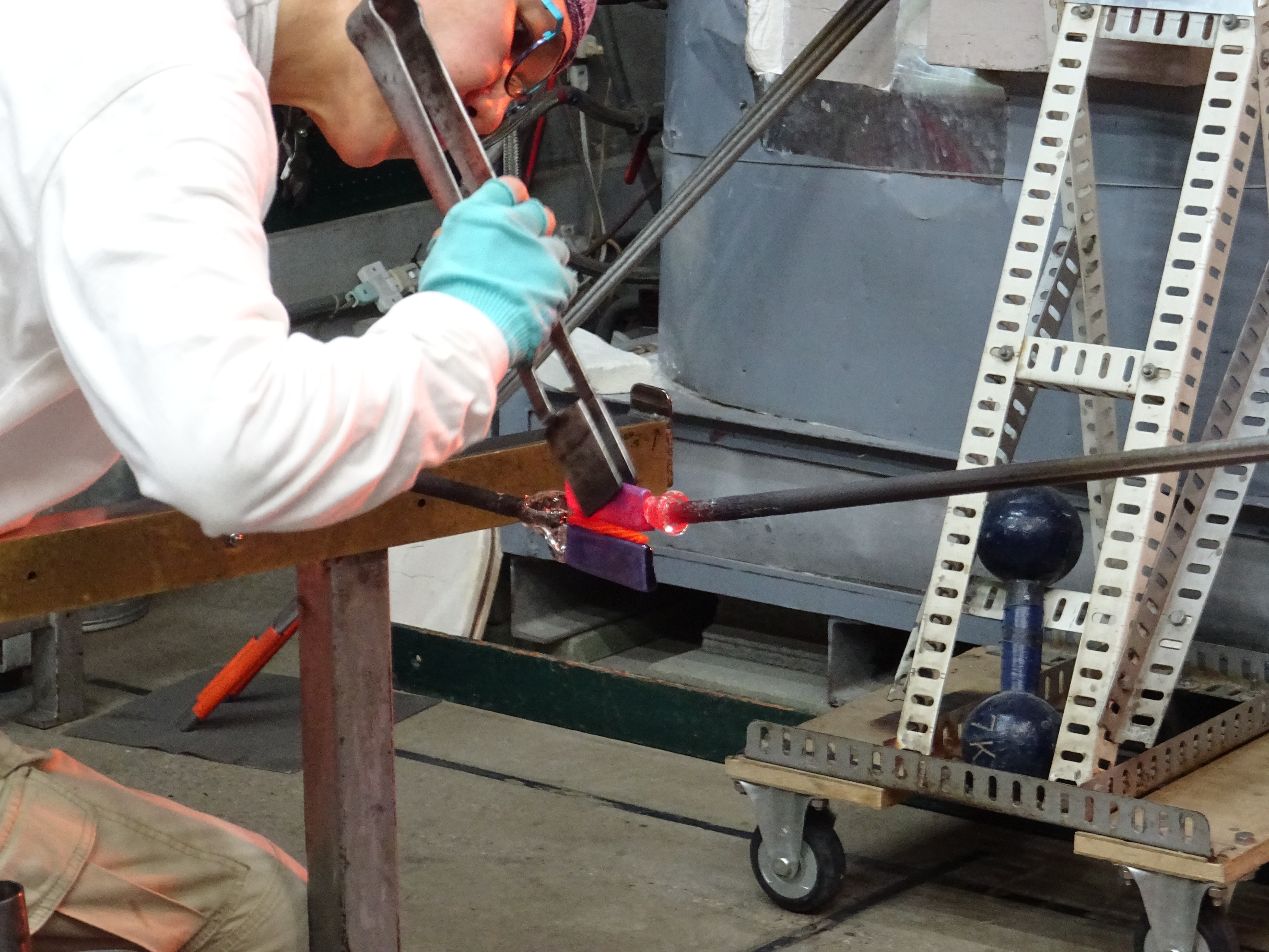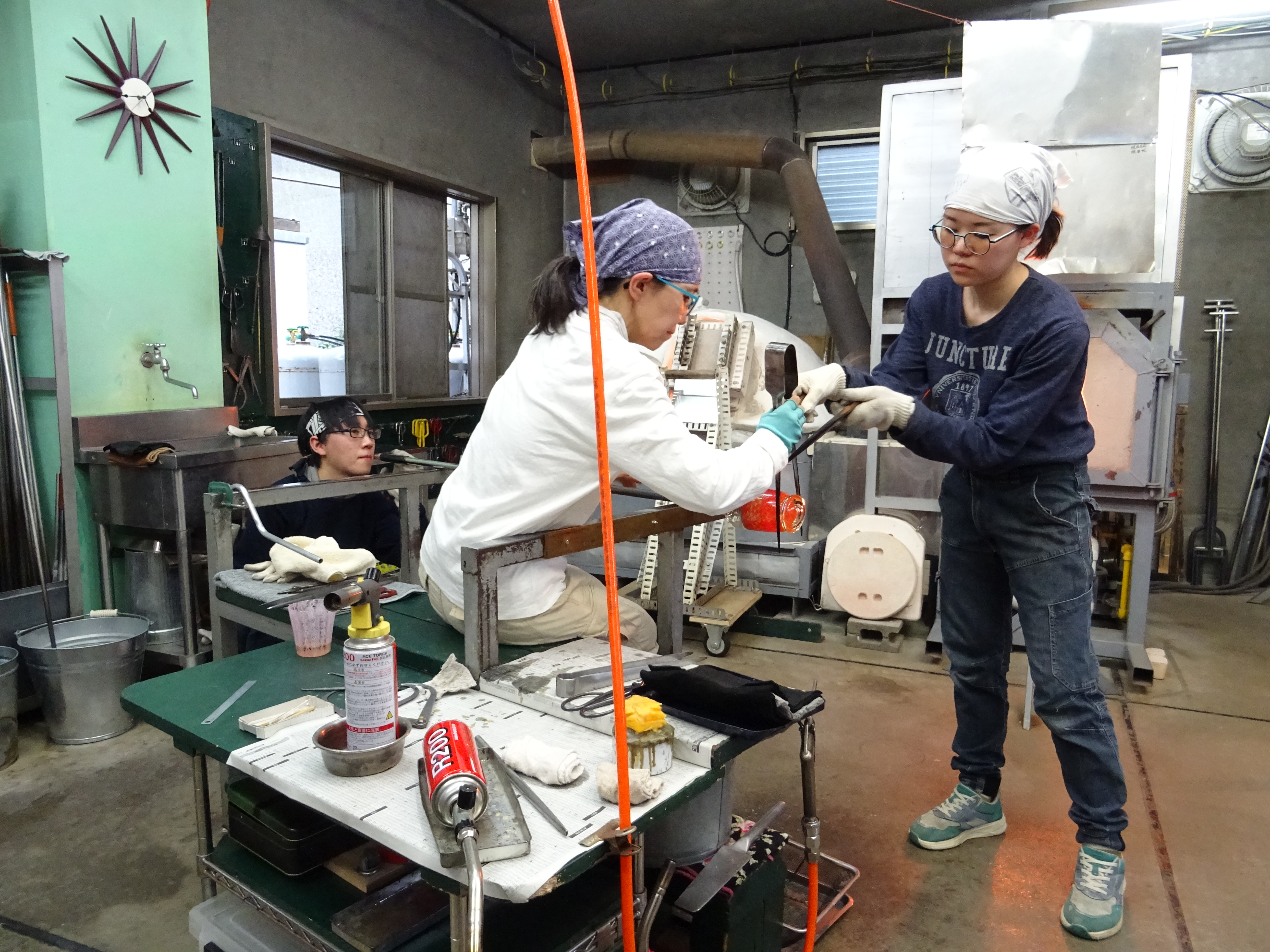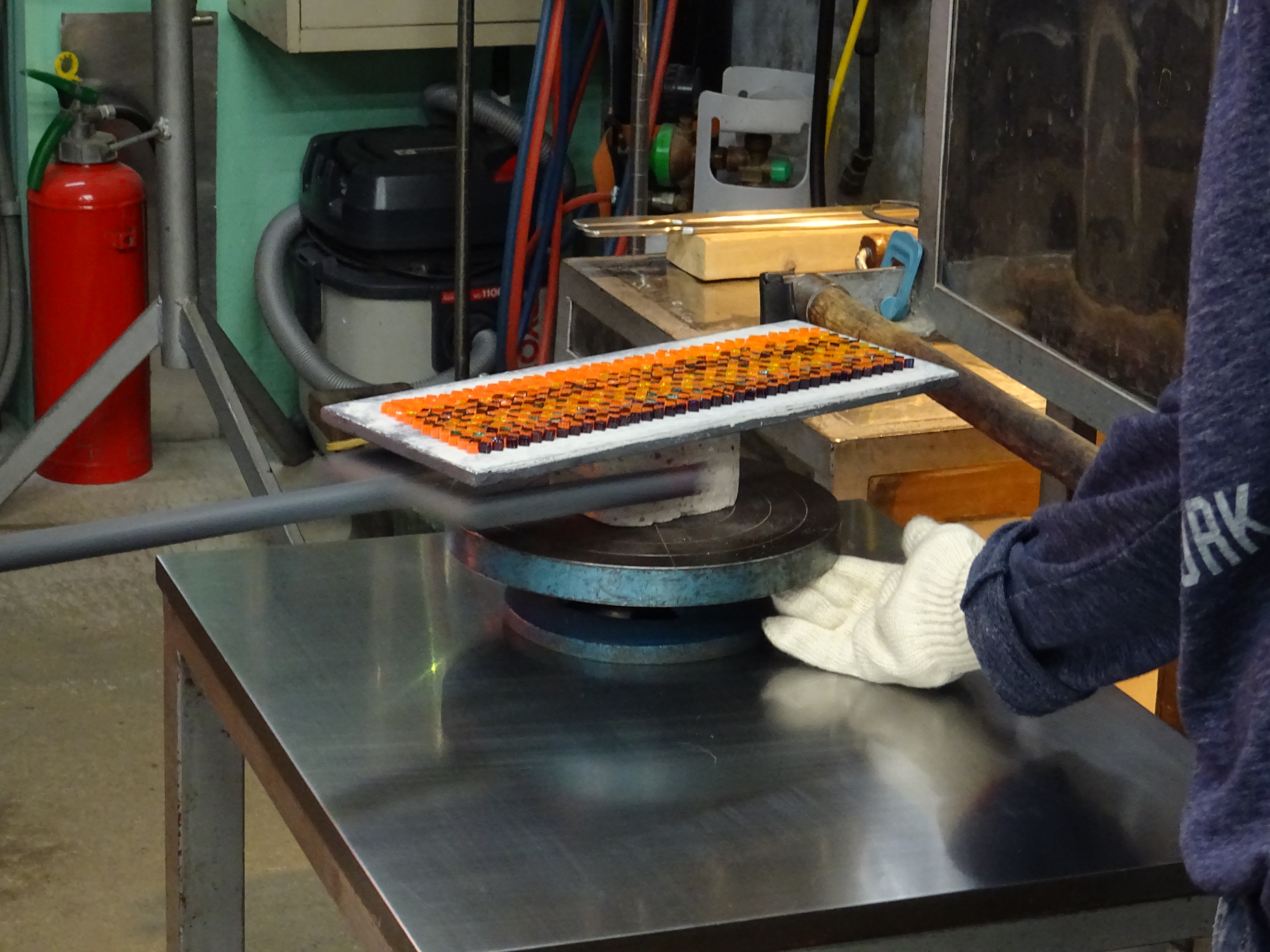 工房見学記 3月、とある日のお昼過ぎ、神奈川県は三浦半島のガラス作家・江波冨士子さんの工房へ見学に行ってきました。工房の名前は潮工房、1998年にパートナーの小西潮さんと江波さんが作った工房です。 私が工房へお邪魔するのは今回で2回目。前回は個展の打ち合わせ、今回は実際に作品がどのようにして作られているか、一泊二日の日程で時間を気にせずじっくりと、工房での作業を見学させて頂きました。 写真<左>アシスタントの方と声をかけあいながら進められる作業の一コマ 「いつもニコニコ潮工房」という文字が書き込まれています。 <右>ガラス製作や掃除道具がきれいに整頓されています ○16時からお夕飯まで 先ずはお茶碗。 お茶碗は江波さんとアシスタント2名、計3人がかりで制作します。 あらかじめ板に並べたムリーニと呼ばれるガラス片を予熱した板に置いて、その後、炉に入れて出す、という作業を何度か繰り返し、ムリーニ同士を接着します。 様々な種類のムリーニを綺麗に並べた状態 これから熱していく 次にムリーニを温めている一方で坩堝から透明のガラスを出して土台を作成します。 土台が出来たらムリーニと接合させて形を整えていきます。 何度も炉に入れて温めながら形を調整し、始めは開いていた口の部分を丸く閉じ、それから江波さんがポンテを回し、彼女の合図に合わせてアシスタントの方がガラスの反対側から空気を吹き込みます。 温めたムリーニを土台に接着しているところ 火とガラスとアシスタントの方と息を合わせて動き続ける事1時間と少し、鮮やかな色の夏茶碗が完成しました。 この日は茶碗の他にコップを2つ製作しました。 コップは一つ作るのに約30分ほどでした。 作品を製作している過程を見せて頂いて改めて思ったのは、吹きガラスの仕事というものは1人ではできないという事。親方がポンテを握ってアシスタントが親方の次の動きを予測しながら動き、タイミングを見計らって道具の出し入れをしたり、合図に合わせてガラスに息を吹き込んだり。声掛けをしながら丁寧に作っていきます。 江波さん「次○○しますよ」 アシスタント「はい」 江波さん「ブロウ」 アシスタント<息を吹き込む> 江波さん「ストップ」 アシスタント<息を吹き込むのを止める> 江波さん「とてもいい感じですよ。」 アシスタント「ありがとうございます。」 江波さん「もう一度やってみましょう。」 アシスタント「お願いします。」 江波さんとアシスタントの方の会話のキャッチボール、聞いていてとても心地よかったです。 ○18時すぎ、お夕飯 夕飯はアシスタントの方が持ち回りで毎日作っているらしく、その日の賄いはパクチーの乗ったココナツカレーとチキンスープとキャベツの和え物。とっても美味しかったです。 夕飯後はムリーニのパーツ作りを見学しました。今回作ったのは紫色の花びらのお花。花弁や花びら一枚一枚のパーツを組み合わせておよそ10*10*15cmの四角柱を作り、最終的にブロアーでガラスに空気を当てながら両端を引っ張り伸ばしていきます。 花びらを製作しているところ 約2mほどに引き延ばされた棒は約30cmずつに裁断され、後日さらに小さいピース(ムリーニ)になります。 江波さんのガラスは多種多様な模様のムリーニを作り、それを組み合わせて吹きガラスの手法で様々な形の器を創り出しています。 ところで、江波さんがガラスに興味を持ったきっかけは、浪人生時代に有楽町のあるギャラリーで見た北欧のガラス作品との出会いだったそうです。それまでは陶芸を学んでいたので、美術大学では陶芸をと思っていたようなのですが、北欧のガラスとの出会いがきっかけでガラスの勉強が出来る多摩美術大学へ入学、その後富山のガラス造形研究所へ入所、アメリカに渡ります。2年間アメリカのガラススタジオでアシスタントを経て、帰国後パートナーの小西さんと共に工房を立ち上げ今に至ります。 また、大学生の頃から長らくガラス中心の生活をしていた中で、2018年、江波さんはヴェネツィアの単身1年間語学留学を決意しイタリアへ向かいました。その一年間はガラスから離れ、ヴェネツィアで語学学校へ通い、ワインを飲み、ムリーニの生まれた場所での生活を楽しんだそうです。 「それまで前に進むことばかりで、途中で立ち止まるという事をしなかったのだけれどヴェネツィアの1年間で少し立ち止まってものを見たり、引き返すという事ができました。」江波さん ガラスと離れる生活をした事によって改めてガラスに真摯に向き合うことができたそうです。そのように出来た背景には1年間江波さんが不在の間もパートナーの小西さんとアシスタントの方がしっかりと工房の炉の火を絶やすことなく、守ってくれていたから、そして帰国してすぐに江波さんが作業を出来るように準備を万端にしてくれていたからだともおっしゃっていました。 工房見学の2日目に江波さんがお茶を用意して下さっている時に、パートナーの小西さ