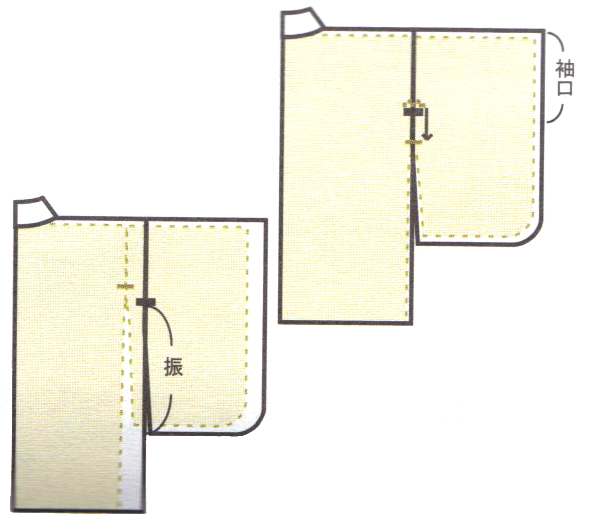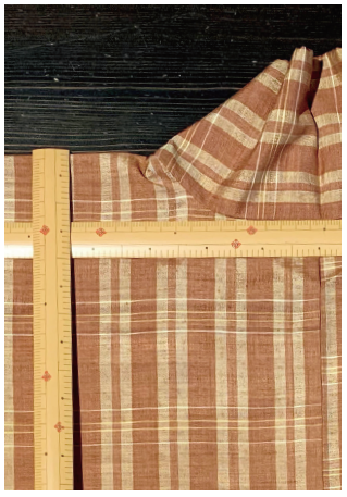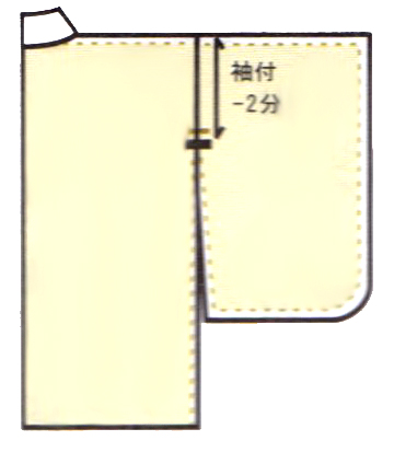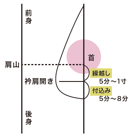 肩山から衿つけまでは1寸2分の差があります。 これは、繰越し5分に付込み7分を足した寸法で 〝出来上がり〟の繰越し寸法です。 付込みは縫い込みともいい、 当店でも以前は3〜5分が目安でしたが最近は5〜8分を標準にしています。 付込みを深く縫い込む事によって衿つけに丸みをもたせ、 その事によって衿まわりが自然と美しくなるからです。
