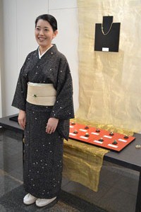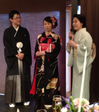 | 花嫁さんは、さちこさんプロデュース たかすオリジナルの黒引き振袖を着てくれました。 (レンタルorお誂えできます) 檜扇の柄の説明をするさちこさん。 新婦となったスタッフも振袖も、我が子のようなもの。 うれしそうです。 |